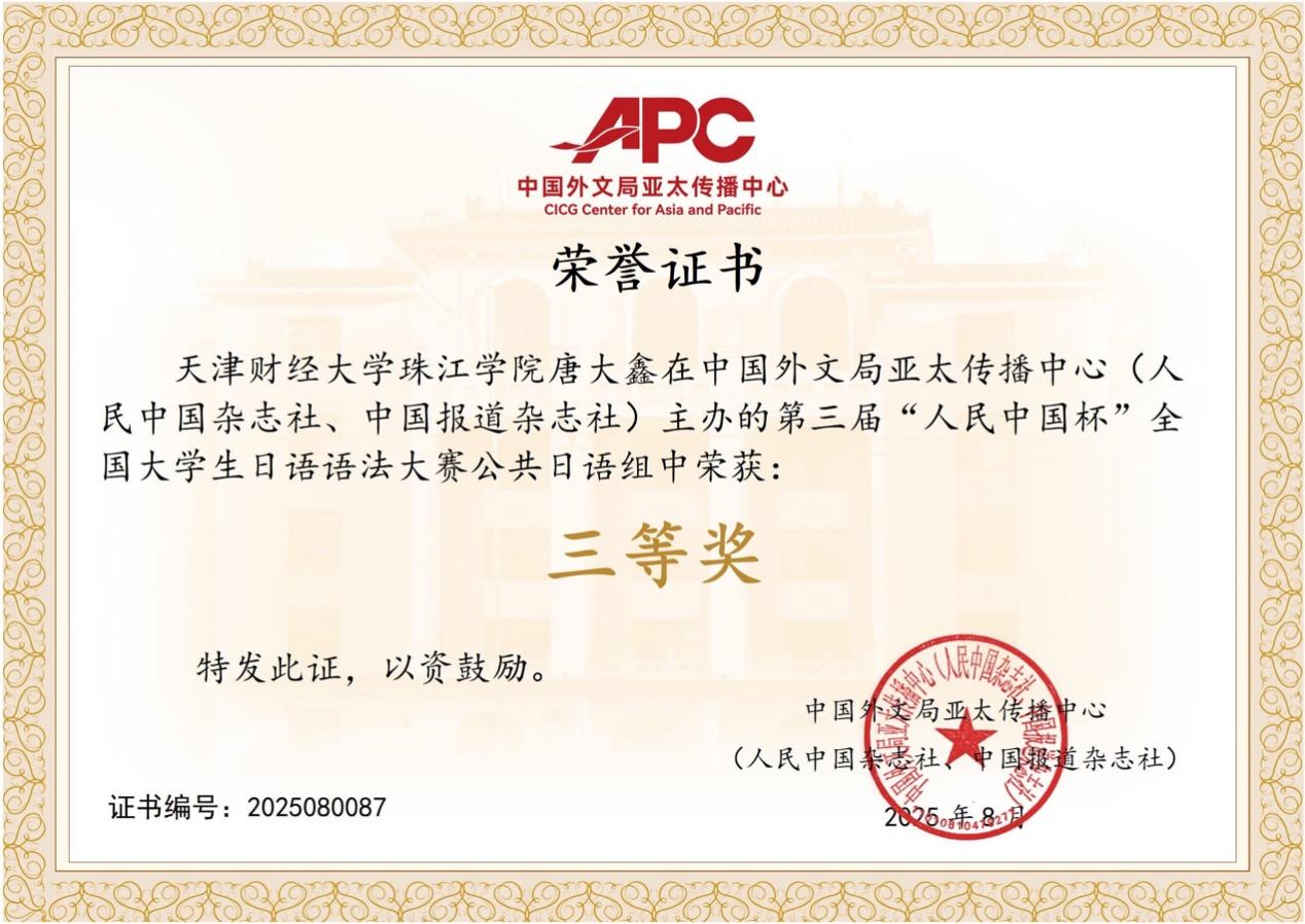 近日,第三届“人民中国杯”全国大学生日语语法大赛圆满落幕,人文学院传播2401班史庆宽、视传2403班唐大鑫同学,在日语教研室罗可老师的悉心指导下,荣获大赛公共日语组三等奖。