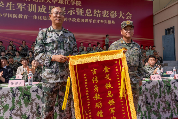 院长助理郭鑫向学生教导队承训教官赠送了锦旗,党委书记梁海龙向帮训部队赠送锦旗,感谢他们在军训期间的辛勤付出和耐心指导。