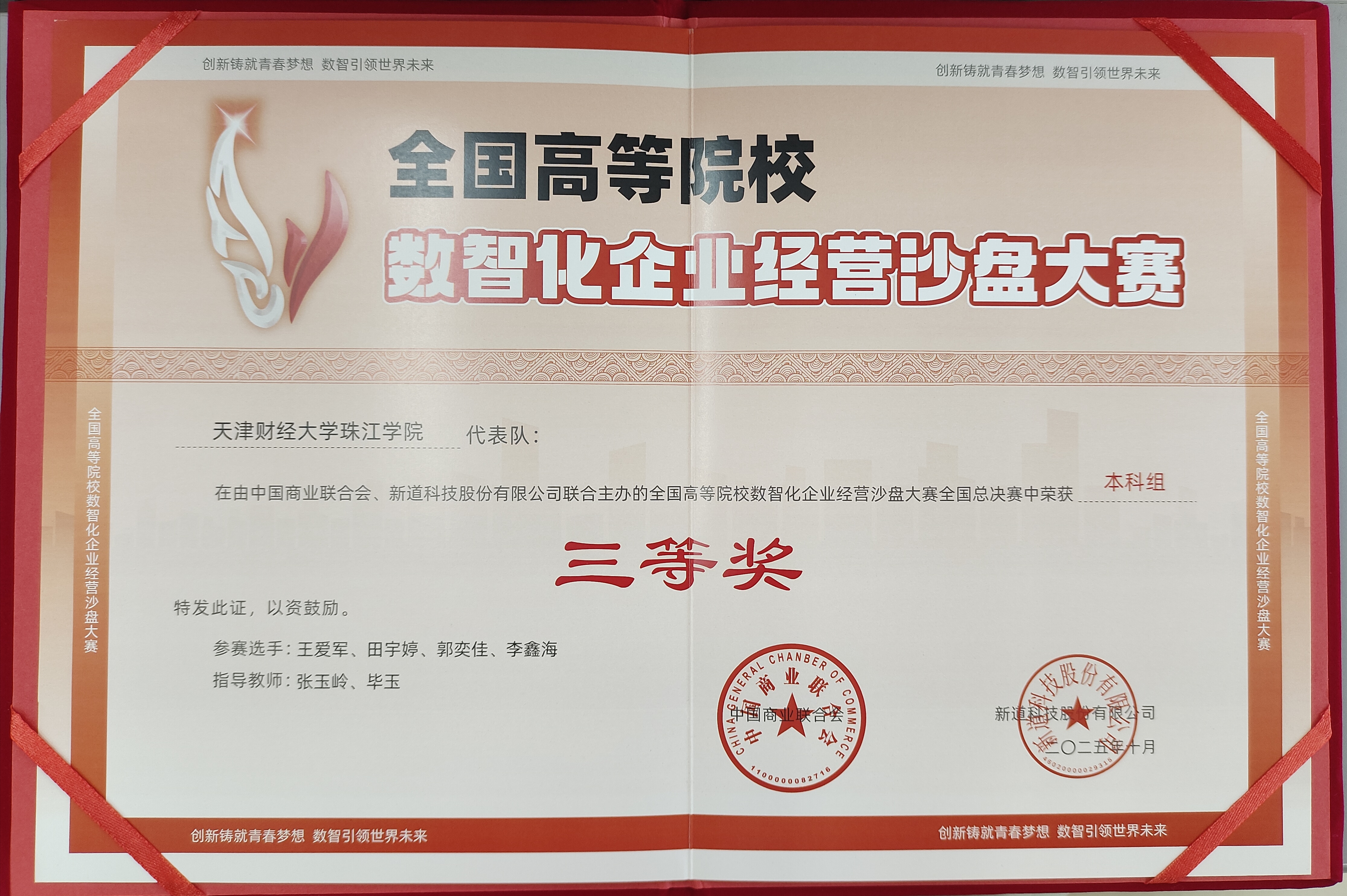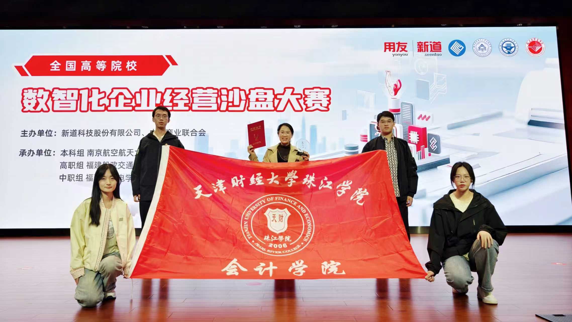 近日,第21届全国高等院校数智化企业经营沙盘大赛全国总决赛圆满落下帷幕。由审计2205班王爱军、注会2202班李鑫海、会计2302班田宇婷、会计2319班郭奕佳四名同学组成的代表队,在张玉岭老师的悉心指导下,经过激烈角逐,从来自全国的120支顶尖高校队伍中脱颖而出,荣获全国三等奖。