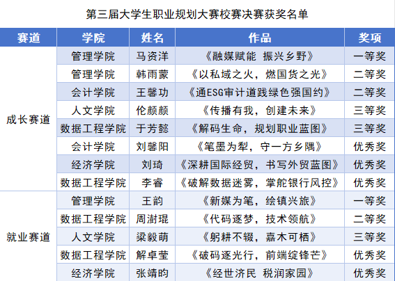 本次大赛作为学院职业生涯教育的重要一环,切实增强了学生的职业规划意识和就业竞争力。未来,学院将始终坚持“以赛促学、以赛促教、以赛促就”理念,持续构建“教育—指导—服务—赋能”于一体的职业发展支持体系,通过课程建设、校企对接、个性化咨询等方式深化就业指导服务,促进高质量充分就业,助力每一位同学稳健走向职业舞台。