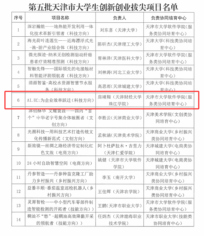 近日,经济学院金专2402班房靖翔同学主持的“AI.EC:为企业效率跃迁”项目成功入选2025年天津市大学生创新创业拔尖项目立项名单,实现了学院在该项目中的零突破。