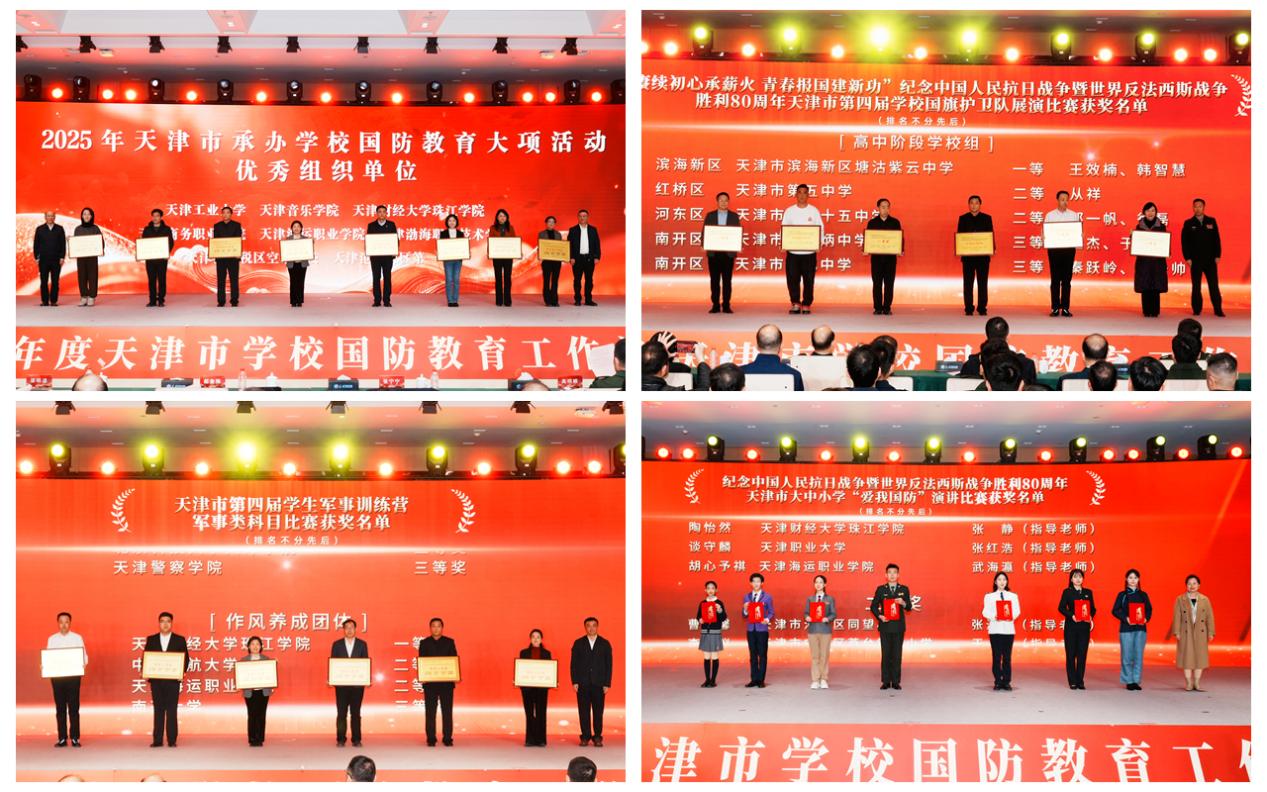 活动中,主办方向我院颁发了“天津市2025年承办学校国防教育大项活动优秀组织单位”、“天津市第四届国旗护卫队展演一等奖”、“天津市第四届国旗护卫队展演优秀组织单位”、“天津市第四届学生军事训练营军事科目总评团体二等奖”、“天津市大中小爱我国防演讲比赛在校大学生本科组第一名”等部分奖项的奖牌和证书,学院副院长李晓鹏、武装部部长吴亚娟、爱我国防演讲比赛在校大学生本科组第一名获得者大学生军人服务中心队员艺术学院音乐2401班陶怡然代表学院上台领奖。