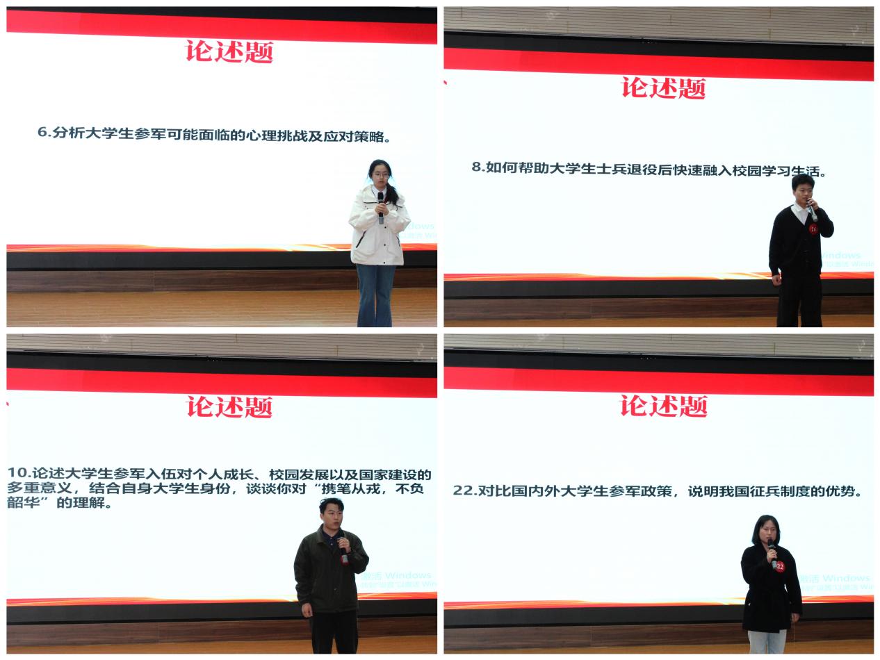 现场问答环节精彩纷呈,必答题、风险题、论述题层层递进,全面考察了选手们的知识储备、反应速度与思辨能力。必答题环节,倒计时启动后,选手们分秒必争,应答干脆利落,展现出扎实的国防知识基础与敏捷的思维反应;风险题环节,选手们勇于挑战,敢于选择高难度题目,现场屏息凝神,选手沉着应对,彰显了无畏的勇气与智慧;论述题环节,选手们旁征博引,逻辑严密,充分展现了新时代大学生的家国情怀与责任担当。