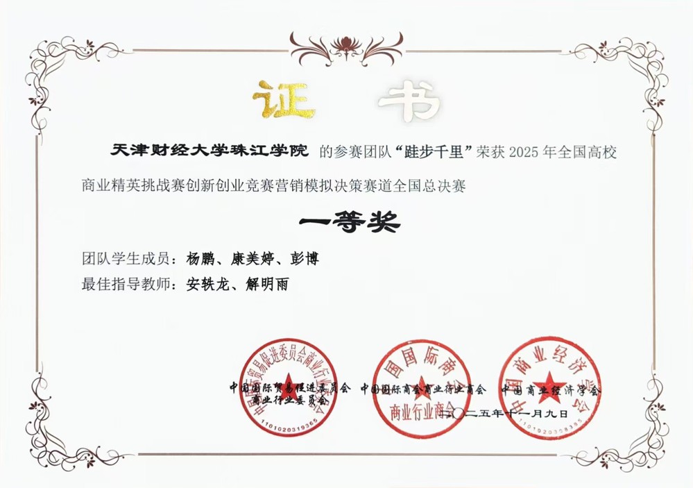 全国商业精英挑战赛创新创业竞赛是国内高校创新创业领域的标杆赛事之一,覆盖创业、营销、流通等多个赛道,位列教育部大学生榜单第47项。该赛事要求团队在限定周期内完成全链条商业决策,同时应对市场不确定性,全方位考察学生商科实战能力与团队协作水平,是高校商科学生的 “实战练兵场”,在教育界与行业内认可度颇高。