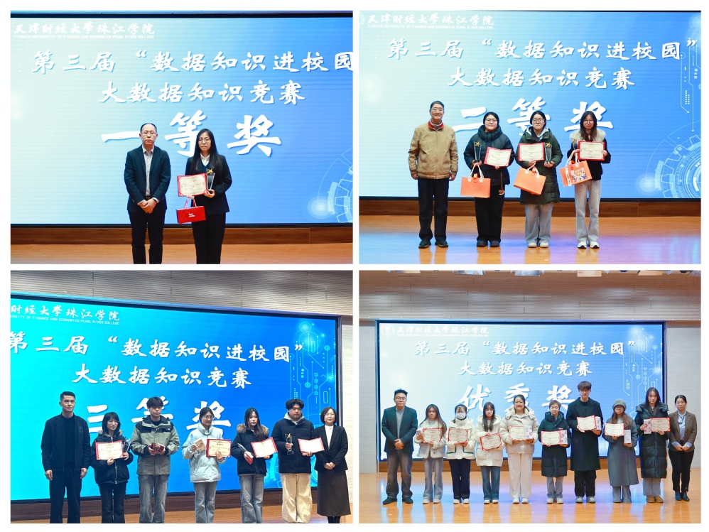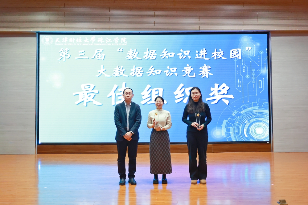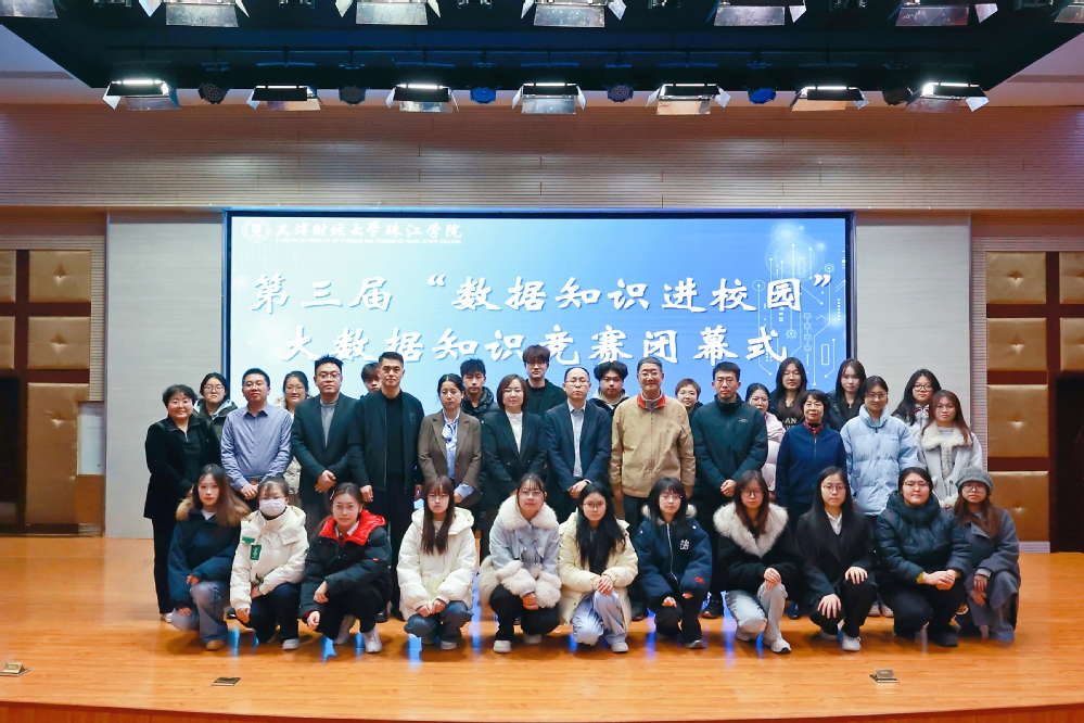 12月23日,由天津财经大学珠江学院与天津市大数据协会联合主办,管理学院与学工部承办的的第三届“数据知识进校园”大数据知识竞赛闭幕式暨颁奖仪式在弘毅楼报告厅顺利举行。天津市大数据协会常务副秘书长蔡迎秋,培训部副主任窦珍珍受邀参加;天津财经大学珠江学院党委副书记、纪委书记白晓,学工部部长郑鲲鹏,管理学院院长张英华教授,党总支书记、学工办主任陈绍生,副院长安轶龙教授,酒店与旅游管理系主任王兰云教授,管理系副主任余耀东副教授及各二级学院教师代表、参赛学生共同参与活动,仪式由安轶龙教授主持。