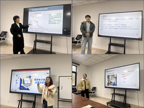 本次活动以“同课异构”为主题,聚焦“同一课程、同一知识点、不同教学设计”的教学理念,旨在通过差异化教学探索,推动课堂教学方式的创新与数智化升级。国际经济学课程组的李冬、盖兆祥老师,以及跨境电商课程组的张紫薇、王实倩老师,围绕共同知识点分别进行了10分钟的说课与15分钟的讲课展示。在说课环节中,四位教师分别从教学目标、教学资源、教学内容、教学过程与方法、课程思政等方面进行了系统阐述,充分展示了数智化教学手段在课堂中的应用与课程思政元素的有机融合。讲课环节中,国际经济学课程组以“生产要素禀赋理论”为主题,从理论逻辑、案例分析到互动讲解,体现了扎实的学理深度与思辨引导;跨境电商课程组以“跨境电商商品标题的制作”为主题,结合电商实训平台与真实案例,突出体现了课堂的实践性与创新性。
