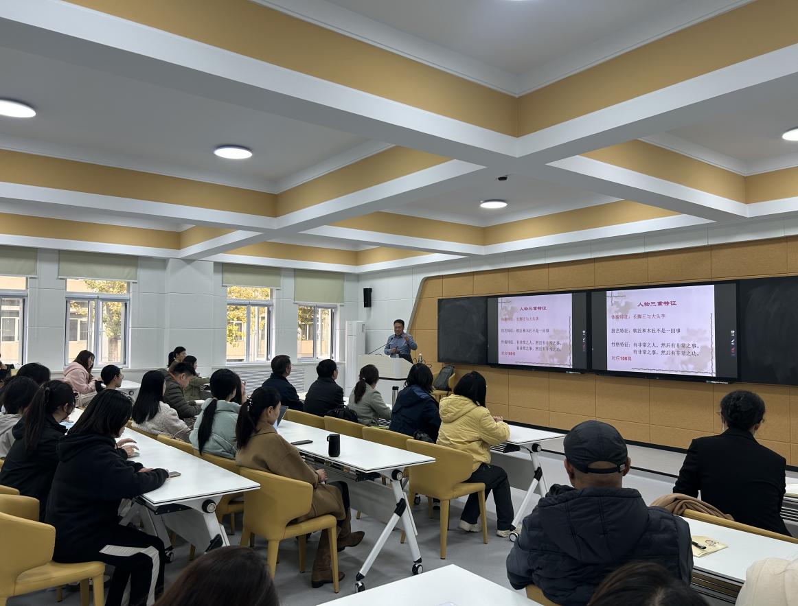 讲座中,周宝东教授紧扣人文素养培育核心,以经典文本细读为核心路径,围绕“人的三重特征”“物的三种属性”及“人物的出场方式”三大维度,抽丝剥茧般解析经典文本的深层运行逻辑。他将文学理论与人文思考相融合,既引导师生感受经典作品中的人文内涵,又传授实用的读写方法,为师生打通“阅读感知—理论理解—写作实践”的链路。