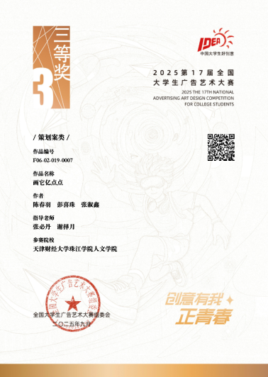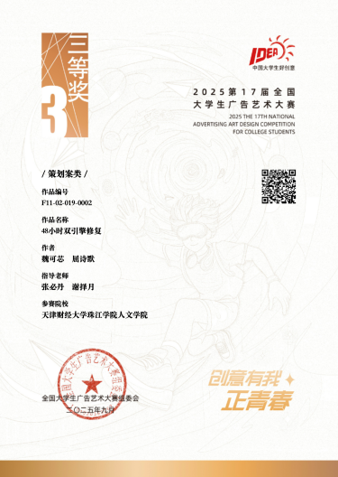 在本年度全国大广赛中,珠江学院学生团队提交的作品从全国数万件参赛作品中脱颖而出,共获得国家级三等奖3项。其中,作品《防火膏手》、《48小时双引擎修复》《画它亿点点》以独特视角和深刻社会洞察,赢得评委高度评价。