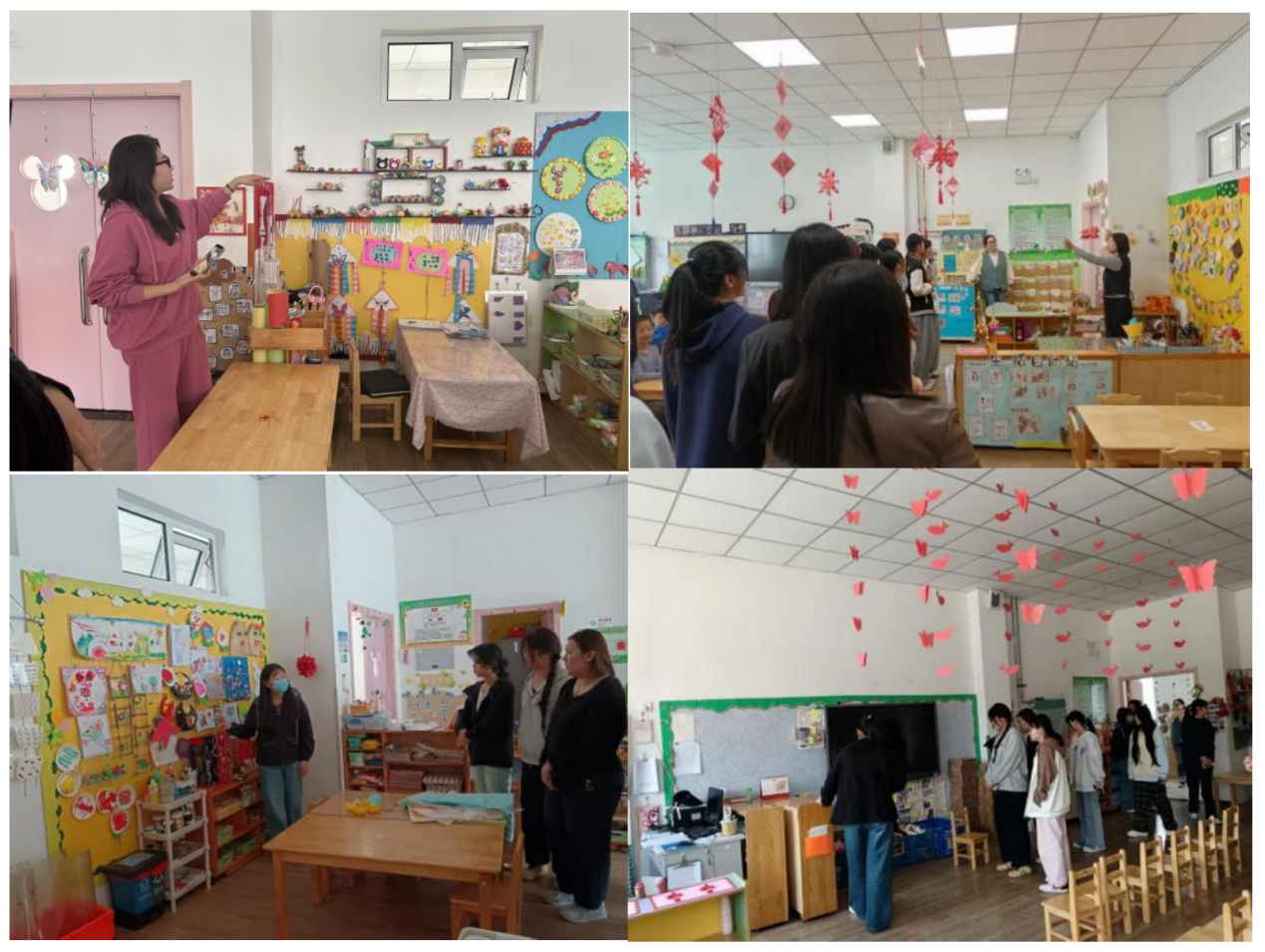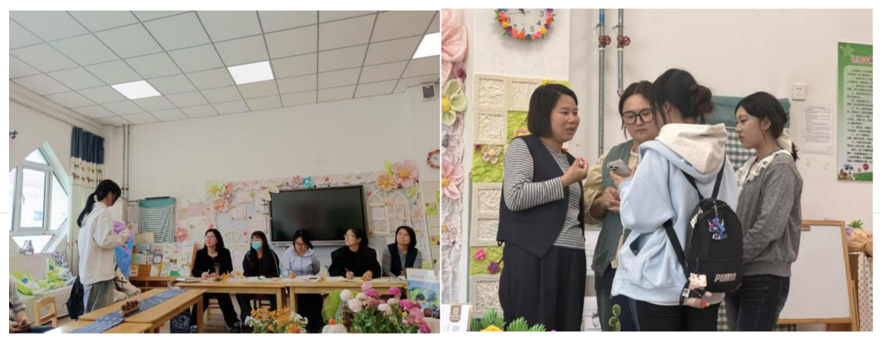 研讨环节,双方围绕小、中、大班幼儿特点,就环境创设适配性、玩教具制作需求展开交流。12名学生代表按年龄段分组,与幼儿园对应年级骨干教师面对面探讨,结合专业所学分享环创设计理念与玩教具开发思路;骨干教师立足一线实践答疑解惑,明确保教工作实际需求。王金鑫园长全程参与指导,刘慧、施晓路老师作总结发言,引导学生深化专业思考,研讨氛围务实高效。随后,幼儿园教师带领学生分组参观班级室内外环创成果及自制玩教具,全方位展示环境育人、玩教具赋能教学的实践细节。参观期间,我校汪子涵、高晓颖同学现场展示大创项目作品,精巧的设计获得园长高度认可;各小组学生代表展示自制玩教具,幼儿园教师从适龄性、教育性、实用性等维度提出改进建议。