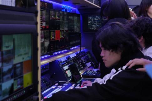 理论讲解结束后,最令人期待的环节来了——同学们带着兴奋与好奇登上Blackmagic 2110 IP VIDEO转播车,近距离体验专业设备。车内导播区配备了多台监视器与专业导播台,实时显示着不同机位的画面信号;技术区陈列着信号处理器、录机等核心设备。技术人员一边操作一边耐心讲解,从信号切换的快捷键到多机位协同的调度逻辑,手把手指导同学们上手体验。在距离转播车不远的点位,现场架设了多台摄像机。在技术人员的指导下,同学们进入实操模式,感受设备的重量与质感,尝试调整焦距和构图并模拟跟拍。