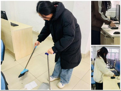 本次志愿清洁服务活动在日新楼二至四楼机房开展,志愿者们分工协作、认真细致,对黑板、粉笔槽、讲台、多媒体设备、地面垃圾、桌椅及卫生死角进行了全面清理,为广大师生营造了舒适的教学环境。同时,志愿者们向全体同学们发出文明倡议,倡导大家共同爱护校园环境,养成良好卫生习惯。
