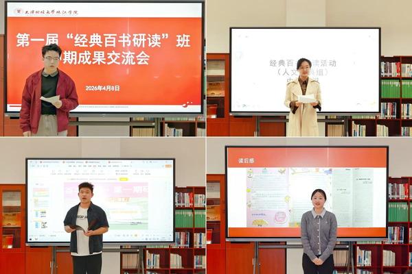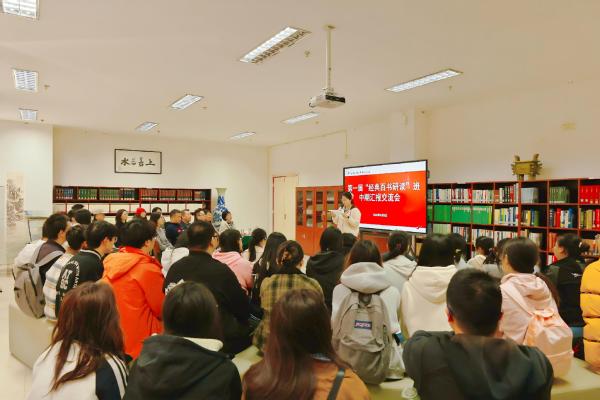 为全面总结“经典百书研读”活动的阶段性成效,4月8日,第一届“经典百书研读”班中期成果交流会在图书馆文华苑顺利举行。各研读小组的专业指导教师、图书馆相关负责人及研读班全体学员共同参加,分享感悟、交流经验。