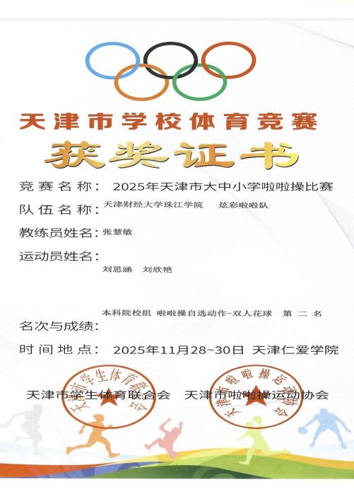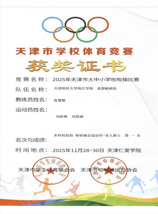 本次比赛由天津市教育委员会指导,天津市学生体育联合会、天津市啦啦操运动协会联合主办,天津仁爱学院承办,共吸引了223所学校的优秀队伍同台竞技,其中报名大学30个单位,中小学193个单位,6124人次运动员。我院学子管理学院刘思涵、会计学院刘欣艳同学,在体育部张慧敏老师的专业指导下刻苦训练:从双人爵士的节奏把控、动作衔接,到花球表演的难度突破、力量展现,每一个细节都经过反复打磨,每一次排练都凝聚着汗水与坚持。比赛现场在动感旋律中展现出极强的凝聚力与艺术感染力,精彩表现引得现场掌声阵阵。