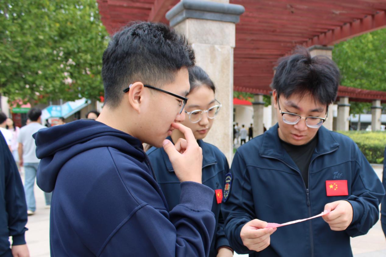 竞赛题目设计丰富多元,贯穿中国近现代史脉络,新生通过抓阄抽取题目,在回顾历史的过程中强化国防意识,主动接受爱国主义教育、弘扬爱国主义精神。这场竞答不仅是脑力的比拼、思维的较量,更成为展现当代大学生丰厚知识储备与昂扬精神风貌的舞台。