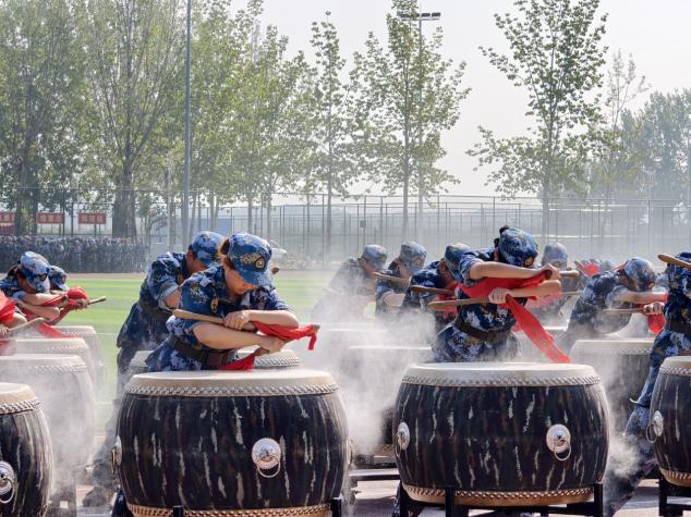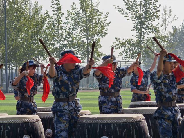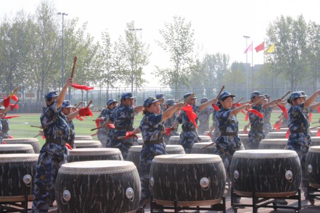 训练场上的鼓点,每一声都砸在人心尖上。鼓队青年们抡起鼓槌,重敲时鼓面震颤,声音似惊雷滚过操场,震得空气都发烫;轻击时节奏轻快,鼓点像急雨敲在青瓦上,利落又鲜活。他们眼神紧盯指挥手势,手臂起落间带着股不服输的劲,汗珠顺着脸颊滑落,却没一个人放慢速度。鼓点从零散到规整,从平缓到激昂,渐渐织成一片震耳的声浪,把“热血澎湃”的魂,融进每一次有力的擂击中。