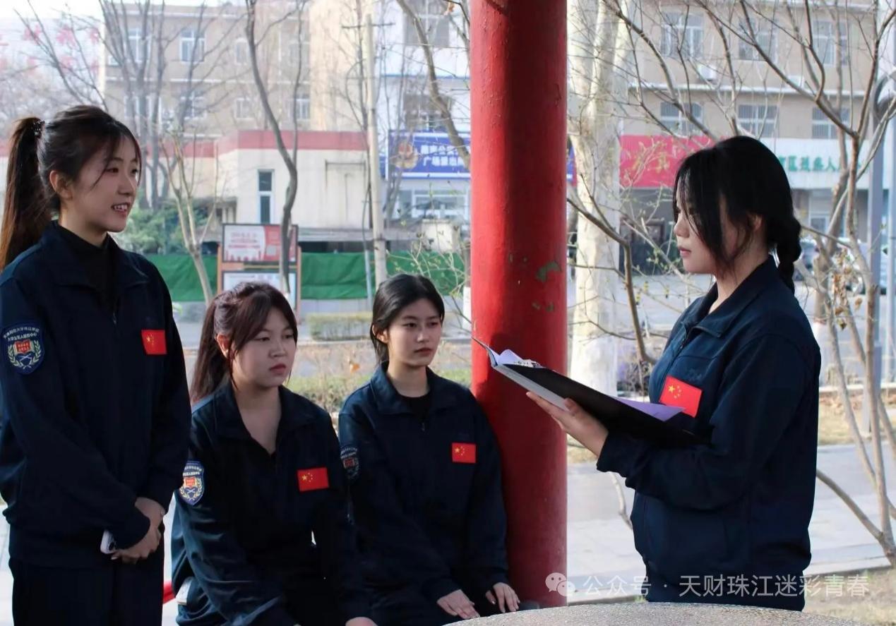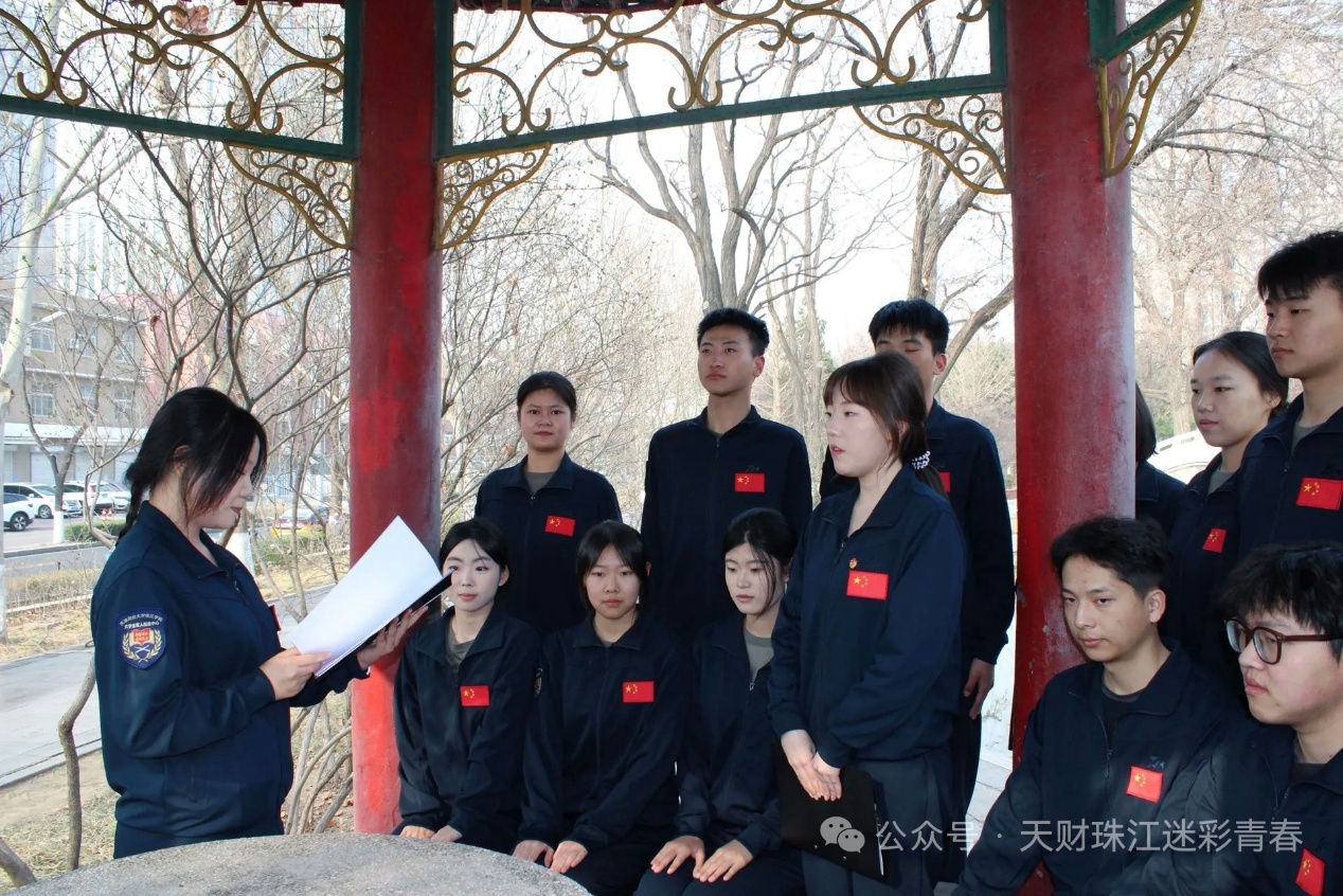在纪念碑前,学生教导队马笑涵、大学生军人服务中心孙梦涵两位同学依次发言。马笑涵同学以冀东革命先烈英勇事迹为切入点,号召青年学子铭记历史、报效祖国;孙梦涵同学结合新时代青年责任,阐释革命精神的现实意义,强调从先烈身上汲取信仰力量。两位同学的发言情真意切,激发了在场师生的爱国热情与历史责任感。活动最后,在学生教导队朱家岐的带领下,全体成员重温青年强军誓词,誓言铿锵。