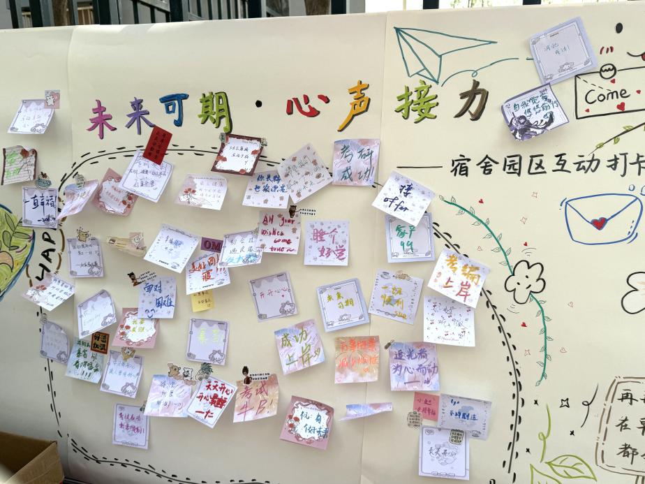 为缓解大三学子升学备考、求职就业的压力,搭建倾诉心声和展望未来的表达平台,4月8日至10日,党委学生工作部(学生处)宿舍管理中心精心举办 “未来可期·心声接力” 善思园区互动打卡活动。本次活动以暖心治愈的形式,让同学们在便利贴与心愿信中书写规划、传递鼓励、寄语未来,为校园生活注入温暖力量与前行动力。