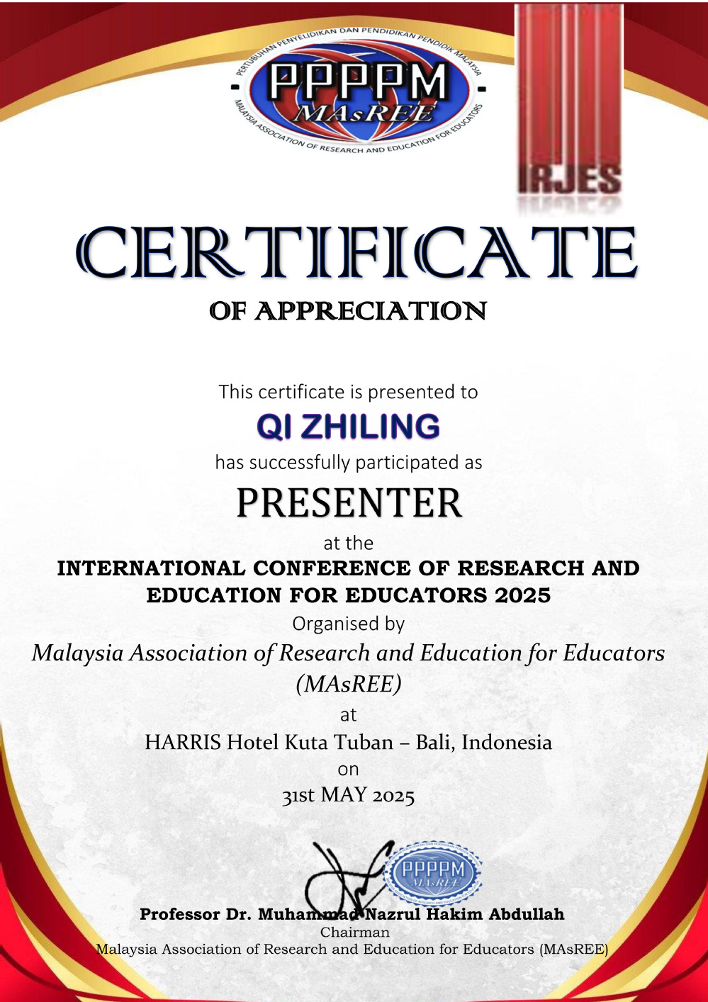 5月31日,艺术学院美学素养教研室主任齐智玲在攻读博士学位期间,通过网络视频,参加了在印度尼西亚巴厘岛举办的“教育工作者研究与教育国际会议”。本次会议由马来西亚教育工作者研究与教育协会(MAsREE)主办,汇聚了来自全球多国的博士研究生及青年学者,共同围绕教育领域的前沿议题进行深度对话与思想交流。