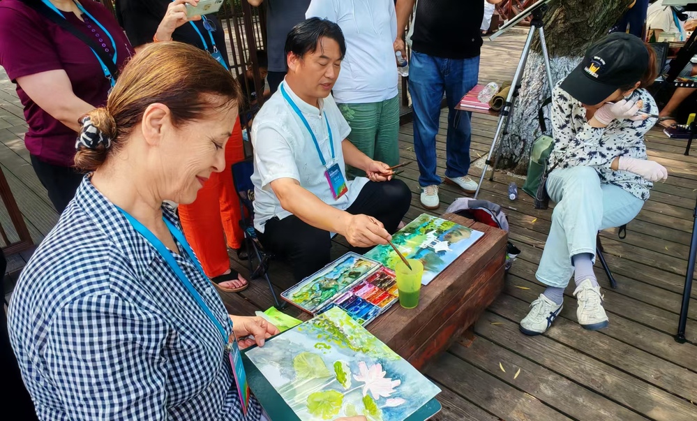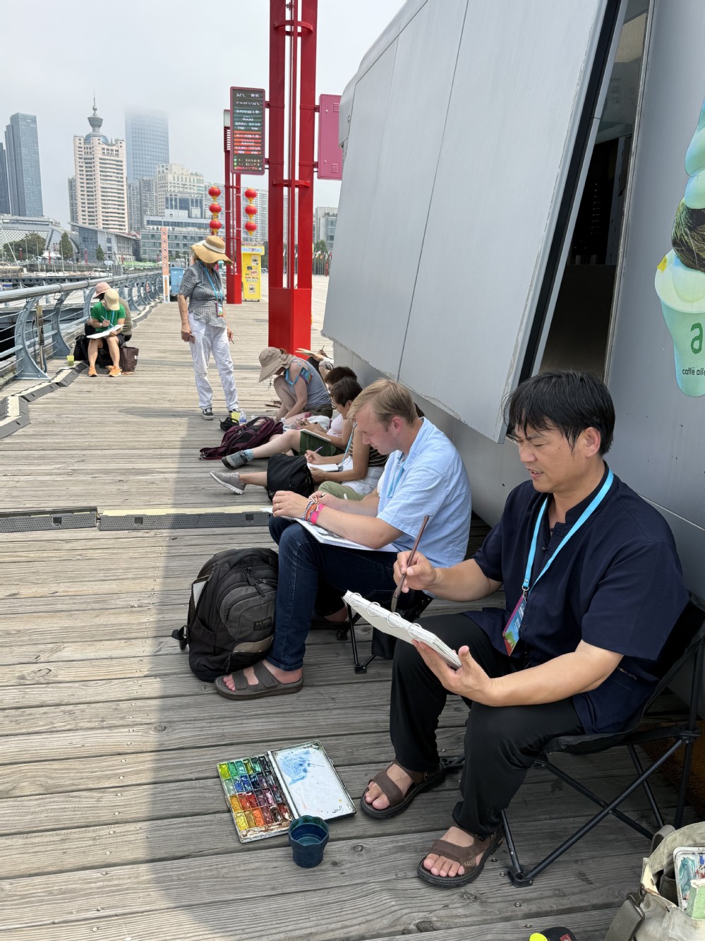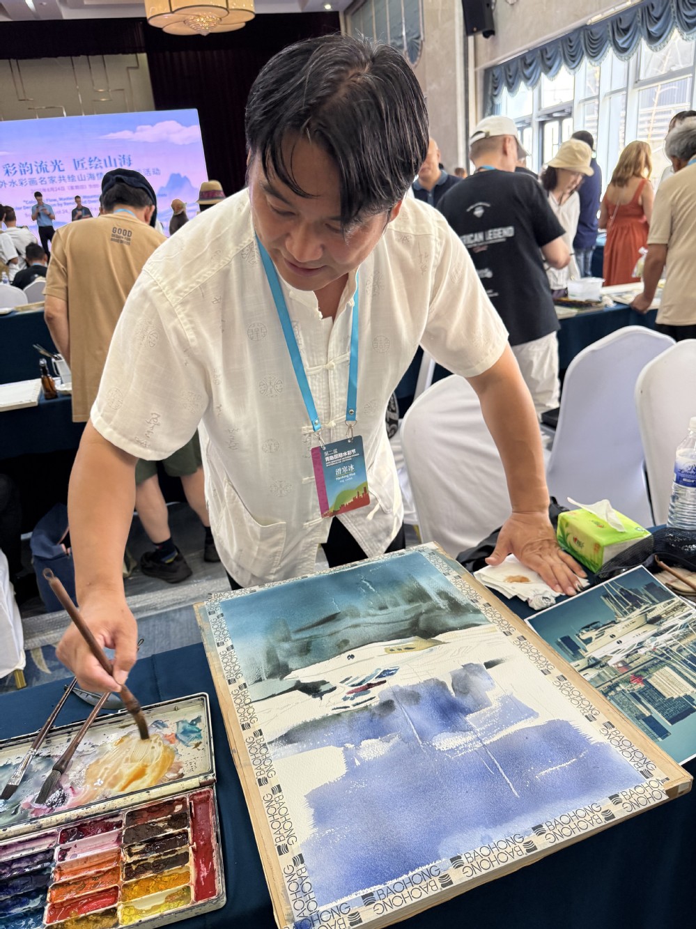 在随后几天的活动中,滑院长积极参与大会组织的写生采风、学术研讨等多项交流活动。与来自加拿大、新西兰、新加坡、法国等多国的艺术家深入青岛特色景点进行写生创作。采风过程中,他与各国艺术家就水彩画的创作技法、艺术表现力等话题展开深入探讨,相互切磋技艺,分享创作心得。