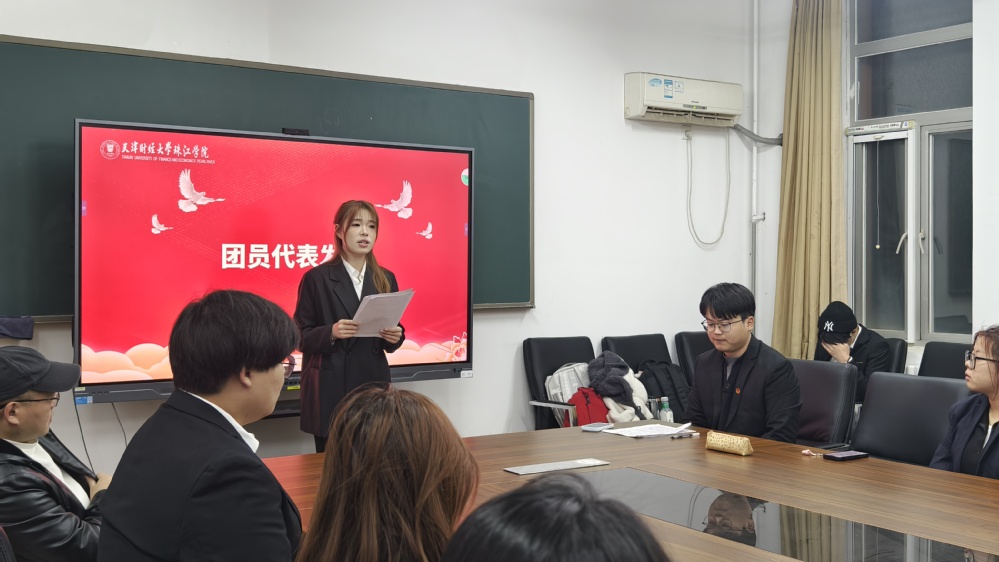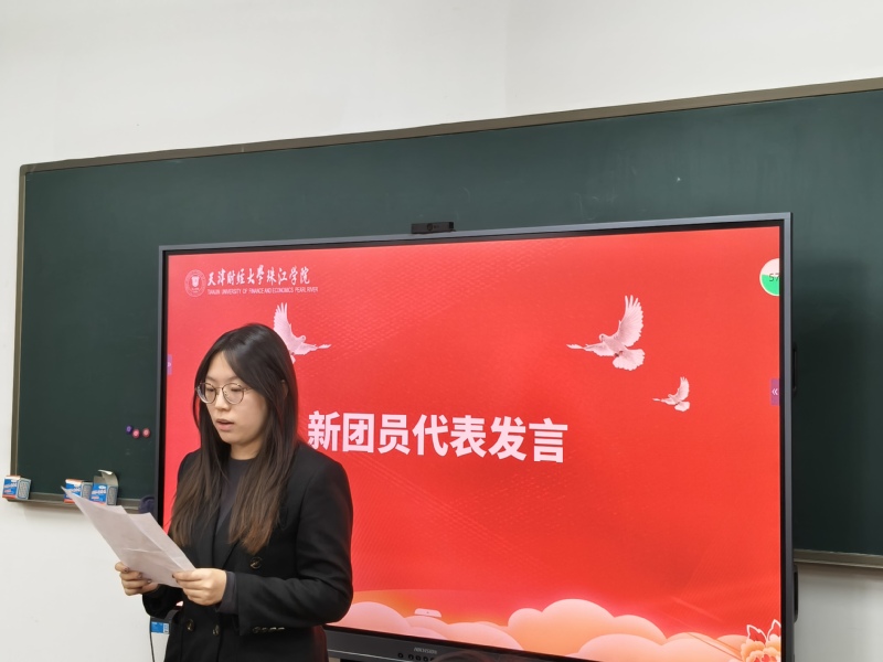 仪式第三项,新团员代表发言。音乐2303班肖曚荞分享了入团的激动心情,并代表全体新团员作出承诺,将牢记入团誓词,严格遵守团的章程,在专业学习中精益求精,在校园活动中积极作为,以艺术之笔绘就青春担当,用实际行动践行“请党放心,强国有我”的青春誓言。