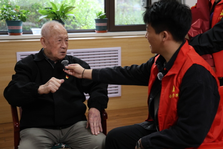 老兵致敬环节是“岁月长河忆英雄壮举”主题的核心呈现。这些老英雄们曾将“小我”融入“大我”,用青春与热血守护家国安宁,岁月从未磨灭他们眼中的坚毅与执着。同学们手持胸花,郑重地为老兵们佩戴在胸前,这枚胸花饱含了师生们对英雄的敬意和礼赞。采访环节中,一位九十四岁老兵深情讲述当年参军报国、保家卫国的故事。每一段经历都饱含着热血与坚守,每一个细节都彰显着家国情怀。同学们认真倾听并为这位老兵送上鲜花。这场互动让师生们切身走近英雄身边,在追忆中厚植信仰。老兵们用一生的坚守,践行了“保家卫国”的庄严承诺,也为在场师生上了一堂生动的爱国主义教育课。