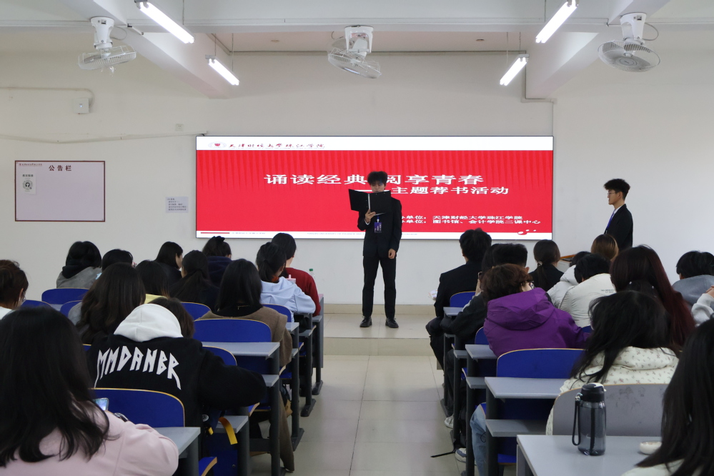 2025年11月12日,由天津财经大学珠江学院图书馆主办、会计学院承办的“诵读经典,阅享青春”荐书分享活动在新上善407进行初赛。会计学院二十余组学生队伍参与本次活动。