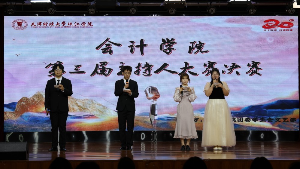 2025年11月19日,天津财经大学珠江学院会计学院在素质教育中心二楼成功举办第三届“会语飞扬谱新韵,星声闪耀颂华章”主持人大赛决赛。会计学院辅导员老师、校主持团团长及上届大赛冠军受邀担任评委嘉宾。经过初赛、复赛的选拔,最终有10位选手站上决赛舞台,开启一场关于声音与梦想的比拼。