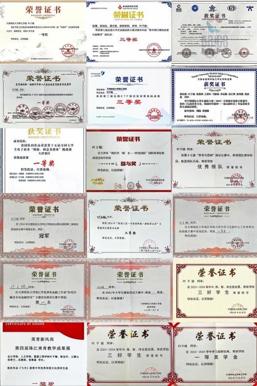 在学习上,她刻苦钻研。在校期间获得一等、二等奖学金、创新创业奖学金、三好学生,一次性通过初级会计考试,取得英语四级证书和普通话二甲证书。她积极参加各类竞赛,获得了2024一带一路暨金砖国家技能发展与技术创新大赛大数据分析应用与决策赛项总决赛金融大数据赛道国家二等奖,2025一带一路暨金砖国家技能发展与技术创新大赛大数据分析应用与决策赛项国家三等奖,“智游宝杯”全国旅游新媒体营销与运营创意大赛全国八十强,全国第二届ETF模拟投资菁英挑战赛三等奖,第九届全国大学生金融创新大赛数字银行模拟经营沙盘赛项三等奖,2025第十五届全国大学生电子商务“创新、创意及创业”挑战赛天津市一等奖,2024年中国国际大学生创新大赛市级铜奖,2025一带一路暨金砖国家技能发展与技术创新大赛第二届企业数智化管理赛项天津市三等奖,2025年中国国际大学生创新大赛市级铜奖。