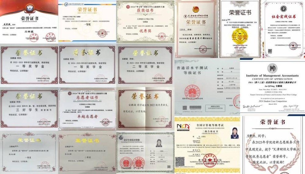 安麒凝,女,汉族,中共党员,天津财经大学珠江学院2022级会计专业学生。任会计2203班组织委员、会计2412班助理班主任。荣获2024-2025学年天津市人民政府奖学金。在校期间积极参与竞赛,获得国家级二等奖等奖项,连续三年获得学院奖学金,同时获评三好学生、优秀共青团干部、优秀志愿者等荣誉称号。